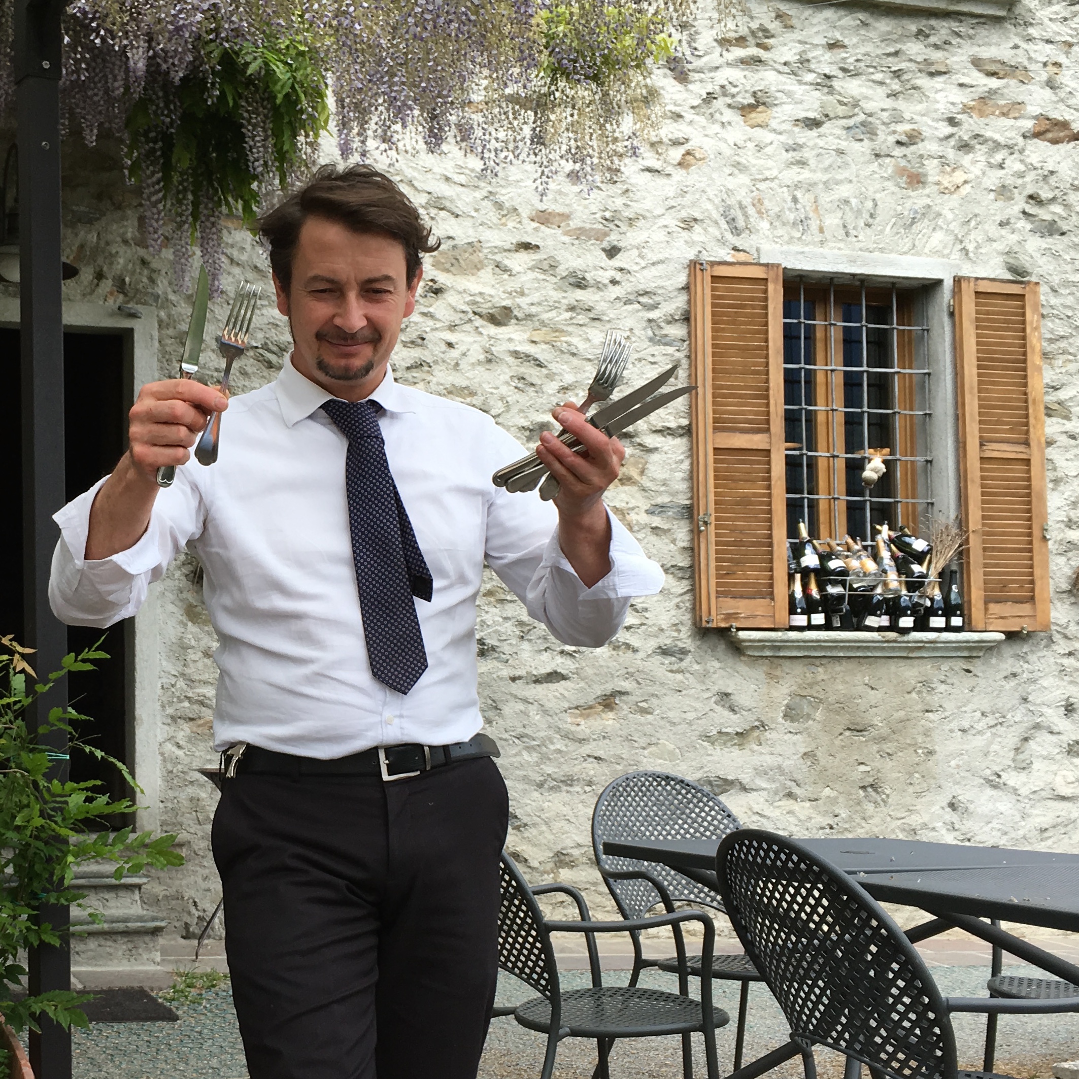 Ristorante Fracia, which we visited on our first day trip to Valtellina from Poggio Verde, remains our favorite. Its location is superb, nestled as it is among the Nino Negri vineyards, and its outdoor dining area is unforgettable. In the spring the purple wisteria hangs down from the pergola and in the fall the seed pods provide the interest. The indoor dining room is also very pleasant. Chef Luca Cantoni prepares reliable and tasty local food and our server, Fabrizio, is professional and friendly and we are always so glad to see them both.
